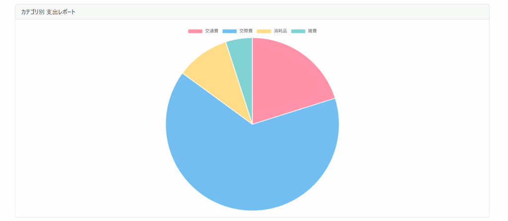 交通費や消耗品費など、カテゴリ別の支出が円グラフで一目瞭然。もうExcelでの集計は不要です。